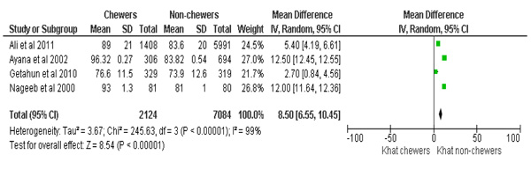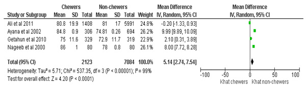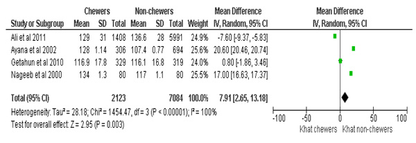 The analysis for synthesizing evidence regarding SBP also considered a similar dataset as used for DBP. Accordingly, khat chewers had higher mean SBP, with the mean difference of 7.9 mmHg, 95%CI [2.6, 13]. The test for the overall effect was; Z=2.9 (p=0.003). The summary effect of the meta-analysis was: Heterogeneity: Tau2=28.18; Chi2=1454.47, df =3 (p<0.00001); I2=100% (Fig. 3).